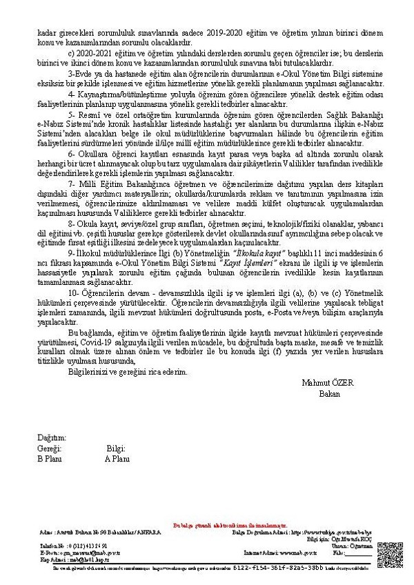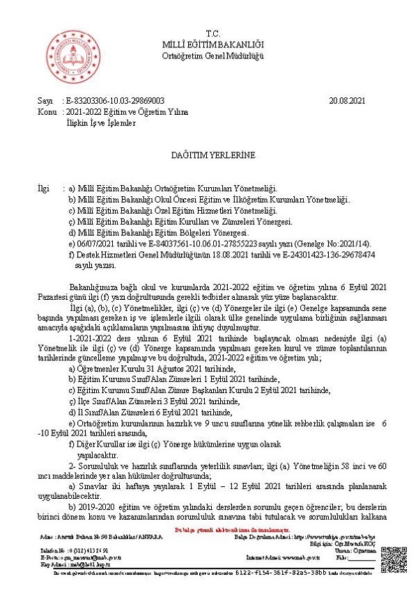 Milli Eğitim Bakanlığının 20.08.2021 tarihli "2021-2022 Eğitim ve Öğretim Yılına İlişkin İş ve İşlemler" konulu yazısı:
