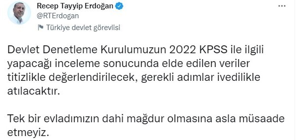 Cumhurbaşkanı Recep Tayyip Erdoğan, 2022 KPSS Lisans oturumundaki bazı sorularla ilgili iddialar üzerine Devlet Denetleme Kuruluna (DDK) inceleme talimatı verdi.