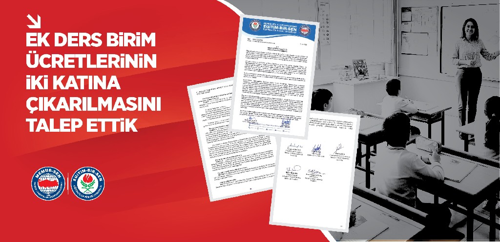 Öğretmenlerin ek ders birim ücretlerinin iki kat artırılması için gerekli düzenlemelerin yapılmasını Cumhurbaşkanlığı ve Milli Eğitim Bakanlığına yaptığımız yazılı başvuru ile talep ettik.