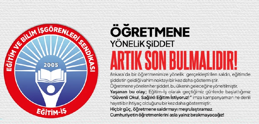 Bu vesileyle tüm eğitim emekçilerini, velilerimizi ve kamuoyunu; şiddete, siyasi zorbalığa ve güvencesizliğe “dur” demek için başlattığımız haklı mücadeleyi büyütmeye, imza kampanyamıza destek olmaya çağırıyor, saldırıya uğrayan meslektaşımıza geçmiş olsun dileklerimizi iletiyoruz.