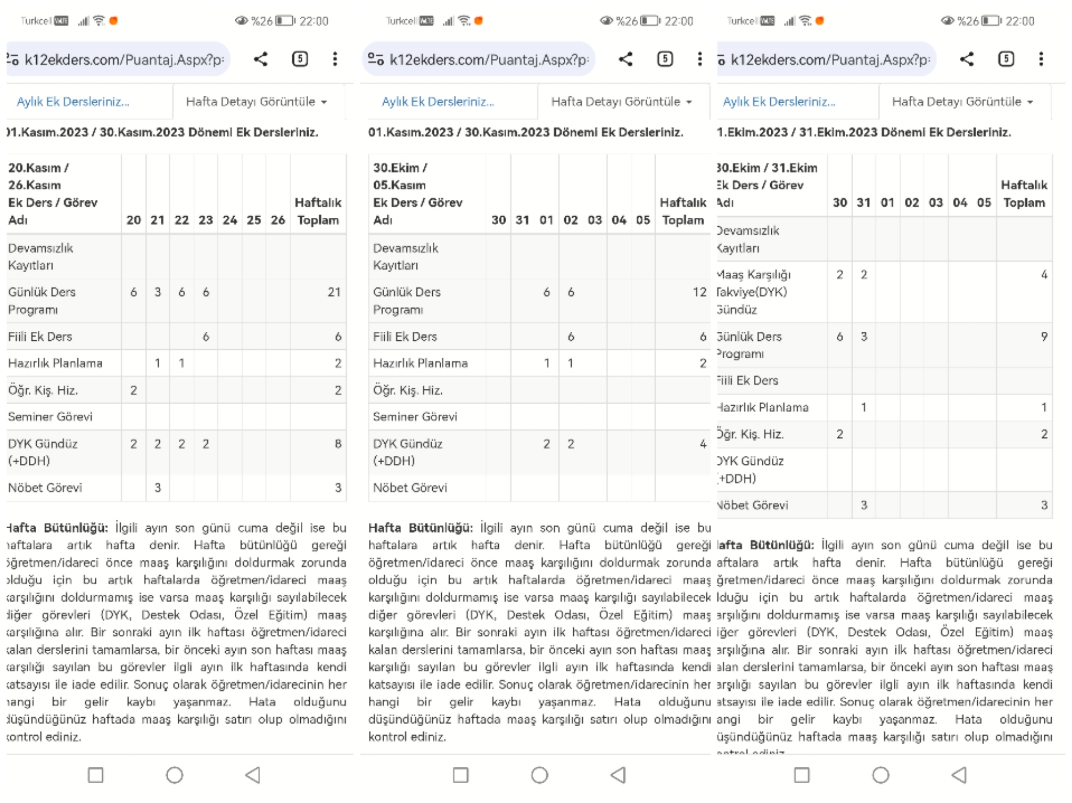 Normal hafta ek ders, Ekim ayı yarım ek ders ve Kasım ayı yarım ilk hafta ders ekran görüntüsü paylaştım inceleyebilir misiniz?