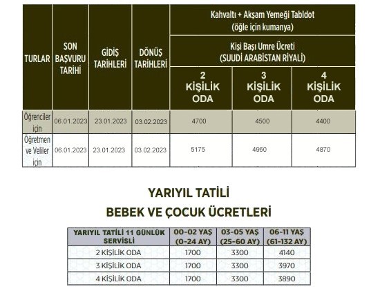 T.C. Cumhurbaşkanlığı Diyanet İşleri Başkanlığı tarafından düzenlenecek olan 2022-2023 Eğitim Öğretim Yılı Yarıyıl Tatili İLKSAN üye ve yakınları Umre Programı(Servisli), 23 Ocak 2023 – 3 Şubat 2023 tarihleri arasında gerçekleştirilecek olup; kontenjanlar sınırlı sayıdadır.