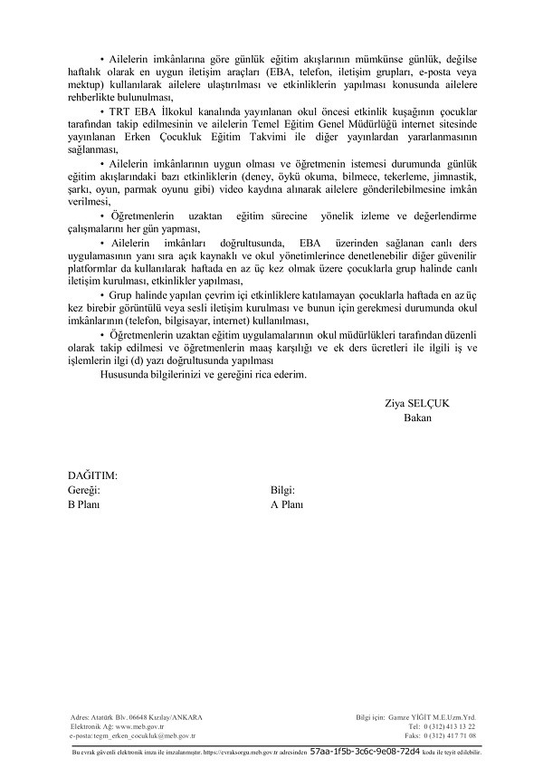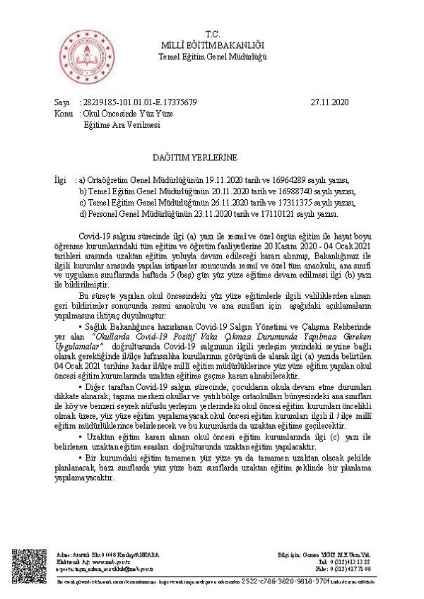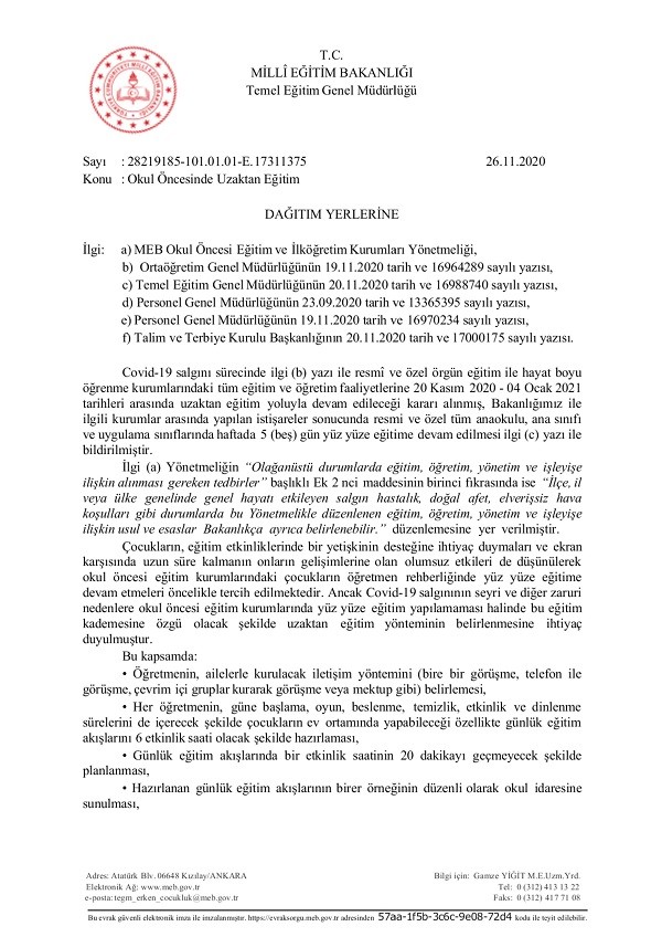 Milli Eğitim Bakanlığının yayımladığı resmi yazılara göre okul öncesi eğitim kurumlarında uzaktan eğitime geçme kararını il ve ilçe milli eğitim müdürlükleri alabilecek.