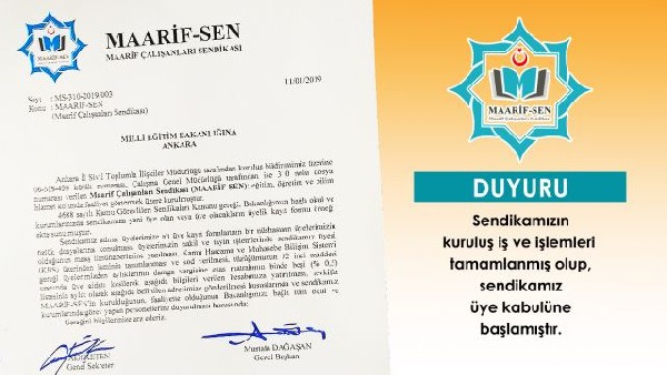 Ankara İl Sivil Toplumla İlişkiler Müdürlüğü tarafından kuruluş bildirimi üzerine 06-MS-438 kütük numarası, Çalışma Genel Müdürlüğütarafından ise 310 nolu dosya numarası verilen MAARİF-SEN; eğitim, öğretim ve bilim hizmet kolunda faaliyet göstermek üzere kurulmuş olup üye kabulüne başlamıştır.
